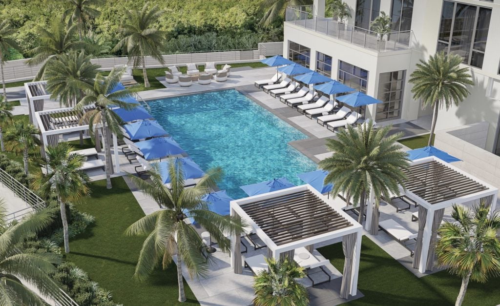 - Resort-style pool deck with cabanas and shaded pergolas
